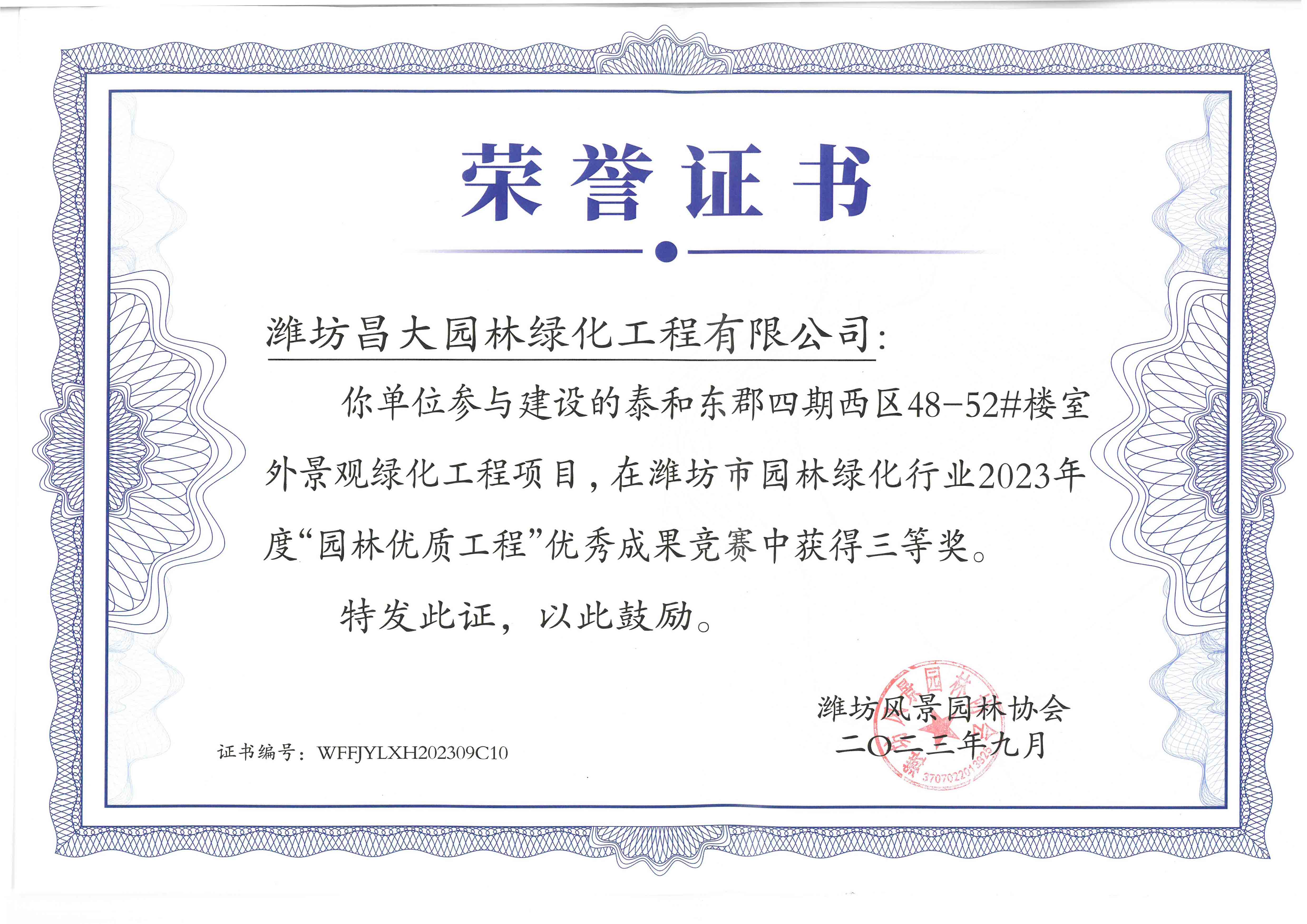 2023年度濰坊市園林優(yōu)質(zhì)工程獎三等獎